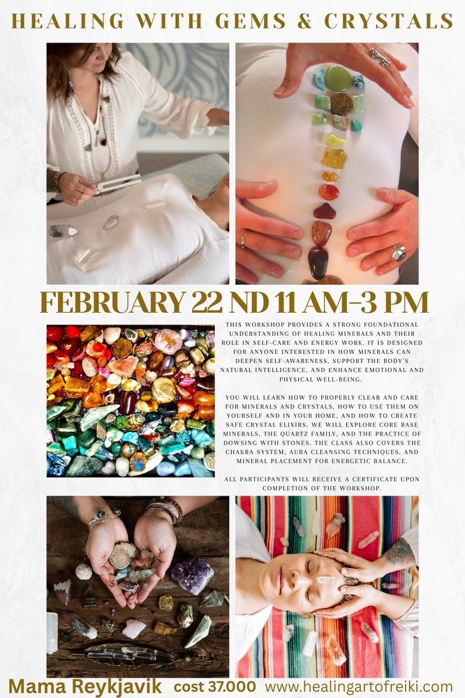 Investment is 44330 ISK COMBO Training - Healing with Gems & Minerals 63330 Be trained on how to work with crystals and minerals to amplify the intention with Reiki.